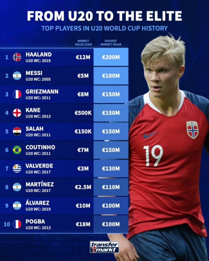 德转统计U20世界杯球星身价变化: 梅西500万→1.8亿, 哈兰德最高