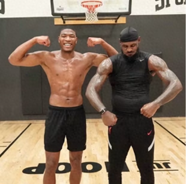 詹姆斯和八村塁合照秀肌肉