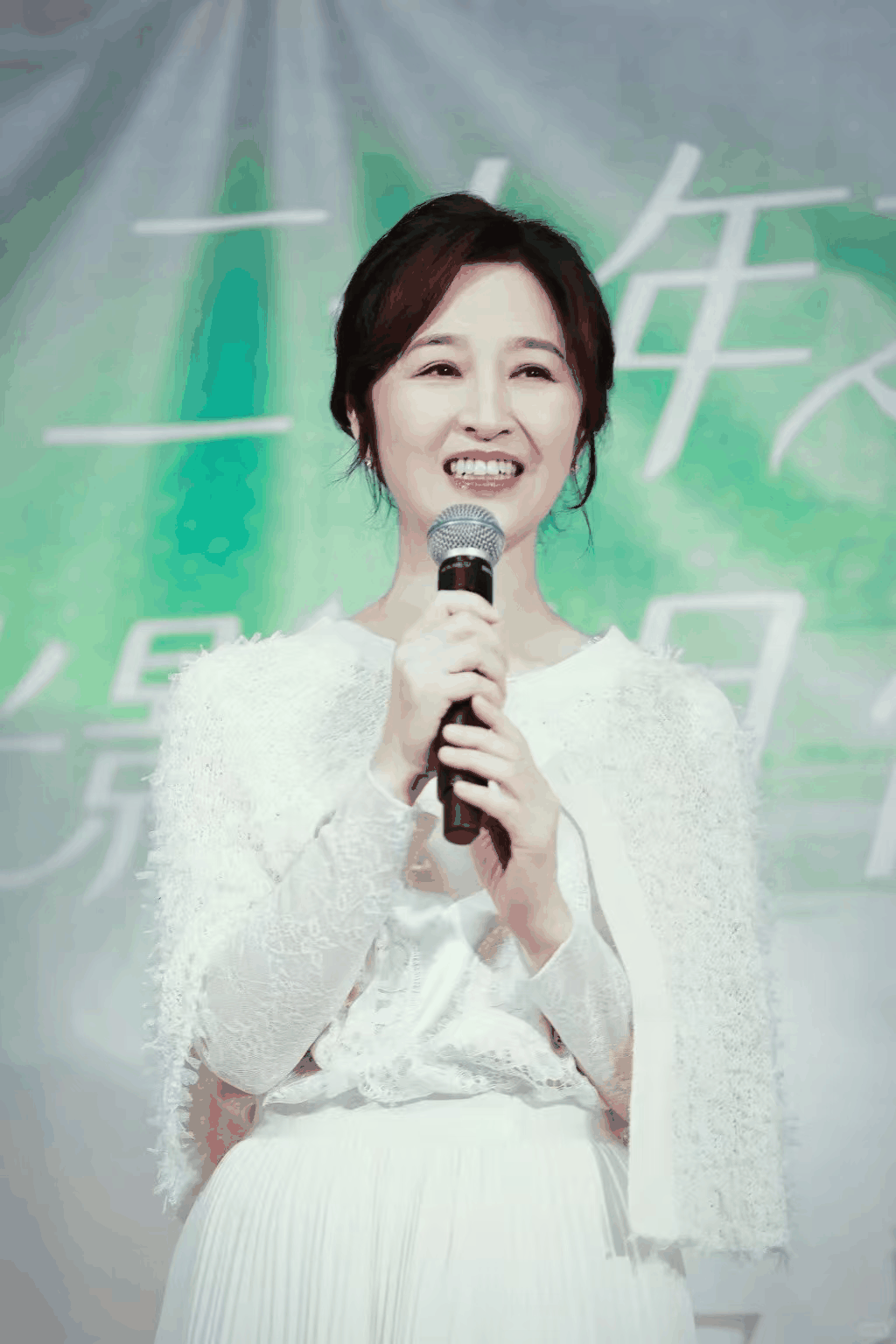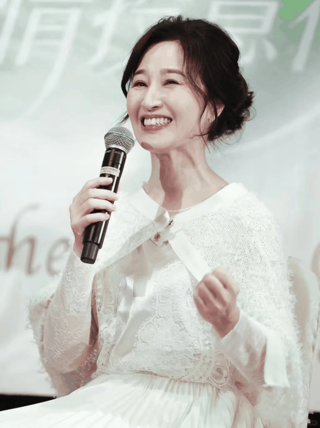 这次见面会,她明显认真准备过,白色蕾丝套裙配小披肩与吊坠,盘发利落,妆容干净不抢戏,整个人像从老照片里走出来