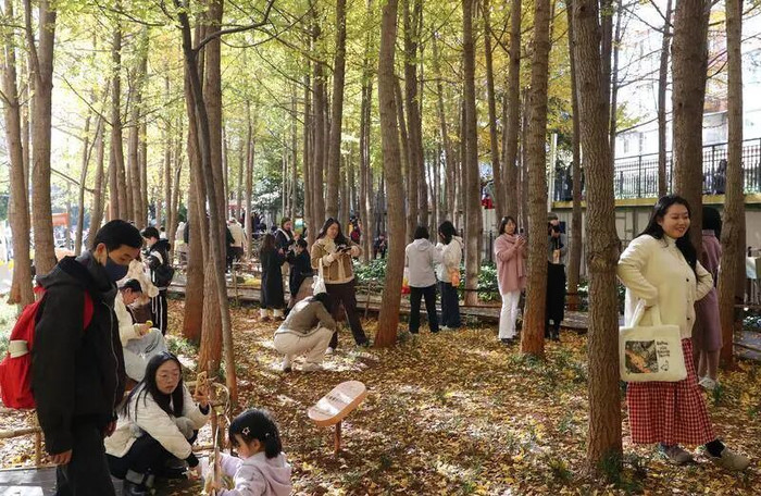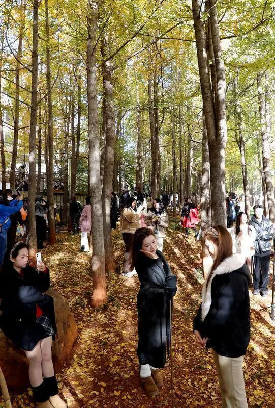 市民游人在版筑翠园银杏林打卡拍照,邂逅一场金色的浪漫。