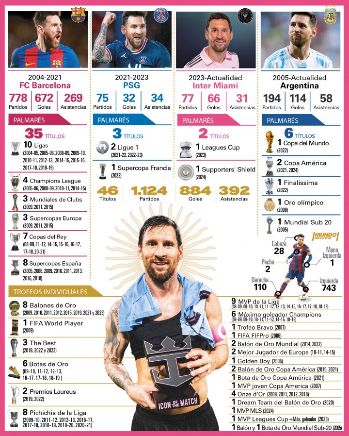 最新版! 世体一图看梅西生涯: 884球392助, 在迈阿密77场66球31助