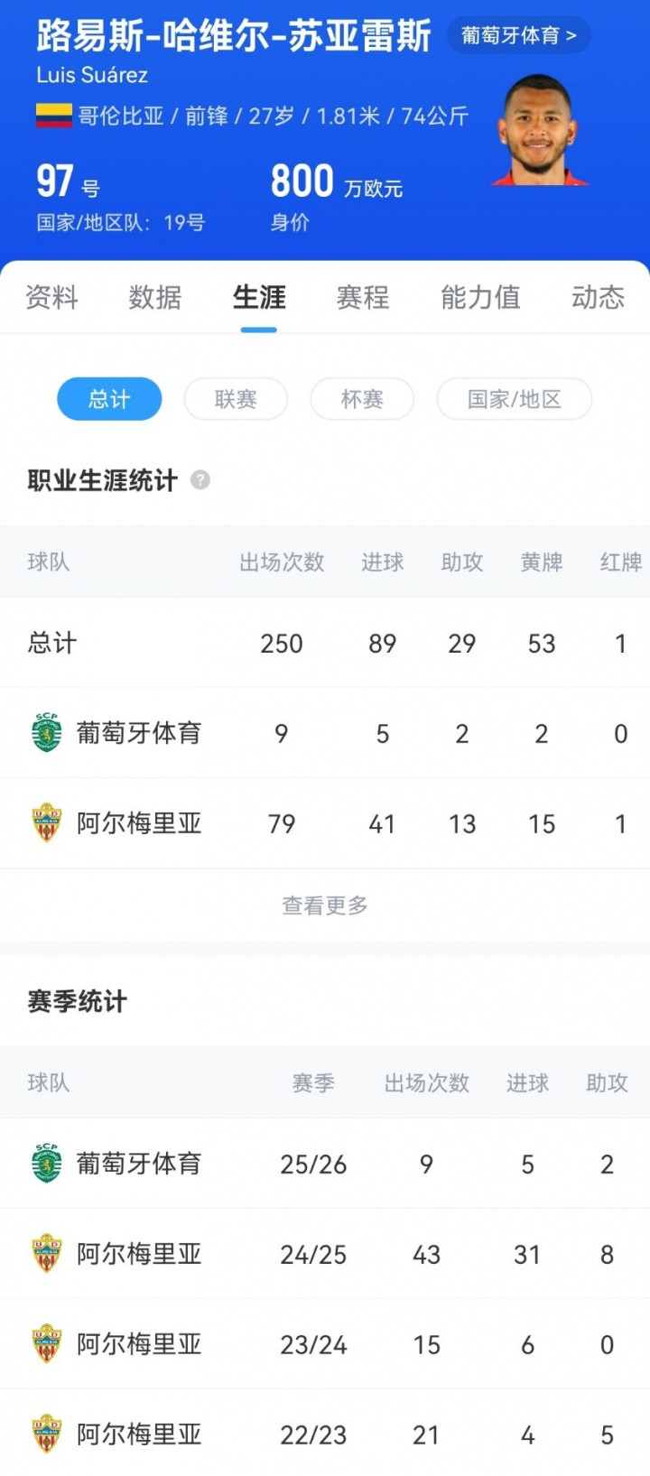 今年夏天,葡萄牙体育花费2220万欧从阿尔梅里亚签下27岁的苏亚雷斯,顶替加盟阿森纳的约克雷斯,而他的德转身价仅为800万欧。