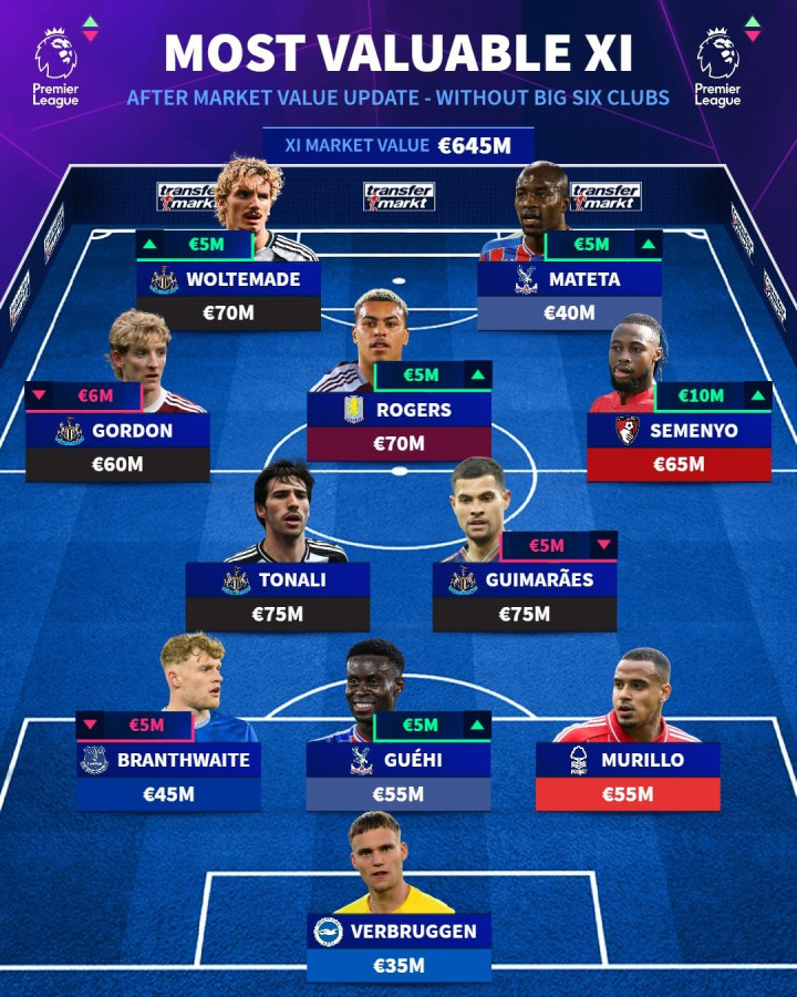 虎扑12月09日讯德转更新了英超球员最新身价,并盘点除BIG6外英超最贵阵容。